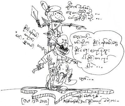 ယခု အႏွီႏွစ္ေထာင္ေက်ာ္တစ္ဆယ္စြန္းေလသည့္ေခတ္ႀကီး ႏိုင္ငံေတာ့္ကံ ကိုယ့္ကံအားေလ်ာ္စြာ ေရာက္လာ ခဲ့ေပၿပီ၊ မိုးဦးက်ဖားမ်ားလို ပါတီမ်ား တအံုးအံုးအြမ္က်ေလၿပီ၊ ႏိုင္ငံ့ဝန္ထမ္းတပ္မေတာ္သားဖားမ်ားကား အြမ္မဆံုး အံုးမဆံုး တၿပံဳးၿပံဳး၊ ႏိုင္င့ံဝန္ထမ္းတပ္မေတာ္ မသား အျခားတပါးမ်ားကား တကုန္းကုန္းႏွင့္ ႏွစ္လံုးသံုး လံုးတြက္ရင္း “တို႔ျပည္ တို႔ေျမ အက်ဳိးကို ညီညာစြာ တို႔တစ္ေတြ ထမ္းေဆာင္ပါစို႔ေလ တို႔တာဝန္ေပ အဖိုးတန္ေျမ” ဟုသာႏိုင္ငံေတာ္သီခ်င္းႀကီးကို “သမိုင္းေတြရႈပ္ အရုိင္းေတြအုပ္ ဘလိုင္းေတြလုပ္ အဲဒီအရႈပ္ထဲ တိုင္းျပည္က် အဲဒီအရႈပ္ထဲ ဒို႔တေတြက် အဲဒီအရႈပ္ထဲ တပ္မေတာ္က်” ဟု ရက္ပင္းလိုက္ရင္း သံပံုးကိုထုပိမ့္ရင္း လွိမ့္ကာလွိမ့္ကာ သီဆိုၾကကုန္ရာလတည္း ။