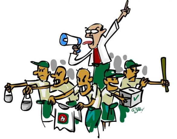 “ေၾသာ္…အဲဒါ.. ဖြတ္ေကာင္ေတြ မဲဆြယ္ေနတာလား ..။ ေအးေလ… ဦးႏုေခတ္တုန္းက မဲဆြယ္သလို လူတကိုယ္ ကားတစီး … တိုက္တလံုးဆို.. ဟုတ္ေသး”