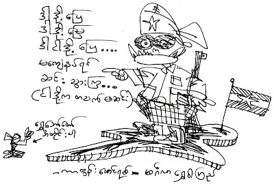 အမ်ဳိးသားေခါင္းေဆာင္၊ လြတ္လပ္ေရးဗိသုကာ၊ တပ္မေတာ္ဖခင္ကိုယ့္ေက်းဇူးရွင္ႀကီး၏သမီး သို႔မဟုတ္ ျမန္မာ့ႏိုင္ငံေရးအခက္အခဲကို ဖ်က္ခြဲႏိုင္ေသာ၊ ျမန္မာႏိုင္ငံေတာ္အတြက္ အနစ္နာခံႏိုင္လြန္းေသာ၊ ျမန္မာတြင္မက ကမၻာကပါတန္ဖိိုးထားေလးစားေသာ တတိုင္းတျပည္လံုးက ခ်စ္ခင္ႏွစ္သက္ၾကေသာ အမ်ဳိးသမီးတစ္ဦးအေပၚ မနာလိုဝန္တိုစိတ္ႀကီးလြန္းလွသည့္ အသက္၇ဝ ေက်ာ္ စစ္သားရင့္မႀကီး၏ မရင့္လွေသာ၊ မတင့္လွေသာ၊ မသင့္လွေသာ၊ မဝင့္လွေသာ အာဏာ့ထုပၸတ္၊ လြန္ယုတ္ပတ္သည့္၊ လုပ္ဇာတ္မ်ားကား ျမွဳပ္သတ္၍ပင္ ကုန္မည္မထင္။ ၇ဝ ေက်ာ္ စစ္သည္ေက်ာ္၏ မေလ်ာ္သည့္အႀကံတို႔ကား ရွည္လ်ားေထြျပား မေနမနား တသြားထဲသြားေနဆဲ ။ သူ႔ဆရာခ်ိဳင္းနိတို႔၏တံတိုင္းမဟာထက္ပင္ ပိုမဟာေသးေတာ့၏ ။