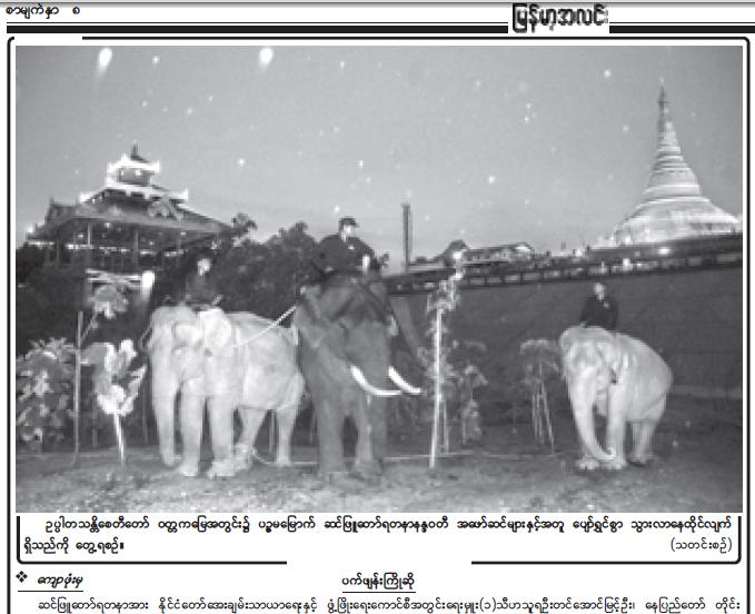 ေတာအတြင္း သဘာ၀အေလ်ာက္ က်က္စားေနရာမွ အဖမ္းခံခ့ဲရသည့္ဆင္သည္ ယခု ေပ်ာ္ရႊင္လ်က္ ရိွသည္ဟု ယေန႔ထုတ္ သတင္းစာမ်ားတြင္ အတည္ေပါက္ ေရးထားသည္။ ဗုိလ္ခ်ဳပ္ႀကီးတုိ႔၏ ၂၂ ႏွစ္ အုပ္ခ်ဳပ္မႈ ကာလအတြင္း ဆင္ျဖဴ ၅ ေကာင္ ဖမ္းဆီးရမိၿပီး ေနာက္ဆုံးဆင္ကုိ ရတနာႏၵ၀တီ ဟု အမည္ေပးထားသည္။