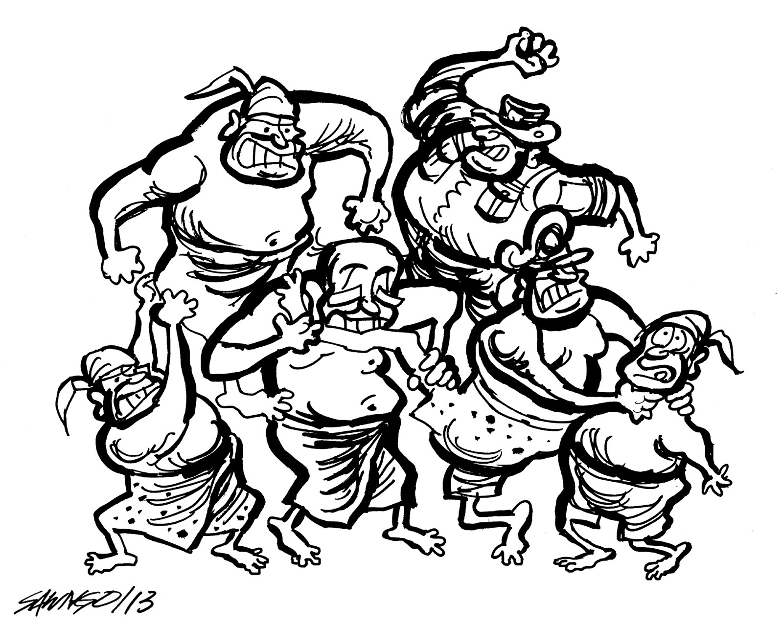 မဟာစိန္ ႏွင္႔ အဖြဲ့သည္.  .ဒီကိုေလသတင္းခန္းမၾကီးထဲသို့    က်ီးၾကည္႔ ေၾကာင္ၾကည္႔ ၀င္လာေစ.။မဟာစိန္ကားပါးစပ္မွ  ဂါထာေပါင္းစံု ရြတ္ရင္း.. ေျခဖေနာင္႔မွ ေျခစာမွဳန္႔မ်ားကိုတံေတြးဆြတ္ထားေသာ   လက္ႏွင္႔ ့တုုိ႔လိုက္     နဖူးေျပာင္ေျပာင္ သို့ သုတ္လိုက ္ျဖင္႔   အလုပ္ရွဳပ္ေနေစ…။သူ့ေနာက္မွ  ေနာက္ေတာ္ပါ အက်ံေပးဦးပ်ံက်ားေရး ၾကီးကား  အသင္႔ပါလာေသာ  ေက်ာက္သင္ပုန္းေပၚတြင္  “ က်ေနာ္တို႔ ငါးမူးတန္းတြင္    ဖ်ာစုတ္တခ်ပ္  ရသြားပါျပီ”  ဟူေသာစာတန္းကို  မၾကာခဏ တဖြဖြ ရြတ္ရင္း   အလႊတ္ အေရးက်င္႔ေနေလေစ.။