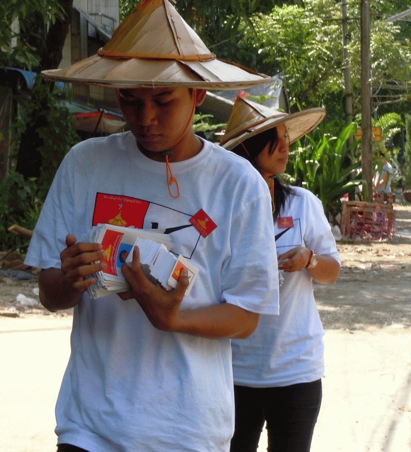 (အလုံျမိဳ႔နယ္မွာ အင္ဒီအက္ဖ္ပါတီက မဲဆြယ္စာမ်ား ျဖန္႔ေနစဥ္)