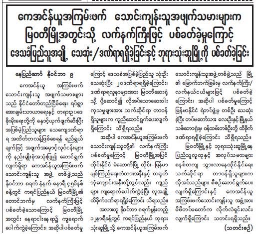 “ျပည္သူလူထုနွင့္ အလုပ္သမားမ်ား စနစ္တက်သြားလာေနထိုင္နိုင္ေရး သက္ဆိုင္ရာ တာဝန္ရိွသူမ်ားက လိုအပ္သည္မ်ား စီစဥ္ေဆာင္ရြက္ေပးလ်က္ရိွေၾကာင္းနွင့္ ေကအင္န္ယူ အၾကမ္းဖက္ေသာင္းက်န္းသူ အဖဲြ႔အား မိမိတပ္မေတာ္က လိုက္လံ ရွင္းလင္းလ်က္ရိွေၾကာင္း” ဟု ေရးထားသည္။