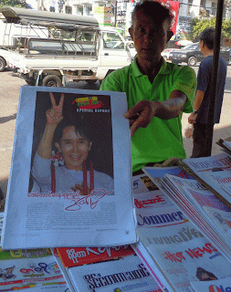 ဒီမိုကေရစီ ေခါင္းေဆာင္ ေဒၚေအာင္ဆန္းစုၾကည္ ယခုလ ၁၃ ရက္ေန႔တြင္ ေနအိမ္အက်ယ္ခ်ဳပ္မွ လြတ္ေျမာက္လာသည့္ အေၾကာင္း သတင္းႏွင့္ ဓါတ္ပံုမ်ားကို အပတ္စဥ္ထုတ္ ဂ်ာနယ္မ်ားတြင္ တခမ္းတနား ေဖၚျပခဲ့ၾကၿပီး ဓါတ္ပံုပါသည့္ အဆုိပါဂ်ာနယ္မ်ား အေရာင္းသြက္လ်က္ရွိသည္ကို လည္းေတြ႕ရသည္။