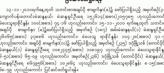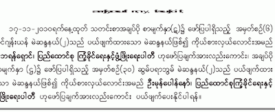 ယမန္ေန႔က ရရွိေသာ သတင္းစာမ်ားအရ ျမန္မာစစ္အစုိးရ၏ ေရြးေကာက္ပြဲေကာ္မရွင္က ၂၀၁၀ ေရြးေကာက္ပြဲအႏိုင္ရ အမတ္မ်ား စာရင္းကို ေၾကညာခ်က္မ်ား ထုတ္ျပန္လ်က္ရွိသည္။ ျပည္သူ႔လႊတ္ေတာ္၊ အမ်ဳိးသားလႊတ္ေတာ္ႏွင့္ တိုင္း ေဒသၾကီးအလိုက္ လႊတ္ေတာ္မ်ားတြင္ အေရြးခံရသူမ်ားကို စာအမွတ္ ၁၄၂ အထိ ထုတ္ျပန္ထားသည္။ ရရွိေသာ မဲမ်ားစာရင္းကိုလည္း ထုတ္ျပန္ထားရာ၊ ရာခိုင္ႏႈန္း ၁၀၀ ေက်ာ္မႈမ်ား၊ ရာခိုင္ႏႈန္း ၈ ရာႏႈန္းသာ ရရွိမႈမ်ားကို ျပန္လည္ ျပင္ဆင္ထားသည့္အျပင္ ပယ္ဖ်က္ထားေသာ မဲဆႏၵနယ္ကိုပါ ထည့္သြင္းထားသျဖင့္ ျပန္လည္ အမွန္ျပင္ဆင္ထားသည္ကို ေတြ႔ရသည္။ သည္ေနရာမွာ ဖတ္ႏိုင္ျပီ။