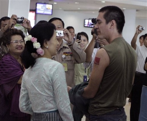 ရန္ကုန္ေလဆိပ္တြင္ ေစာင့္ေနေသာ ေဒၚေအာင္ဆန္းစုၾကည္ ႏွင့္ ဘန္ေကာက္မွ ေလေၾကာင္းျဖင့္ ေရာက္လာေသာ ကင္မ္ အဲရစ္တုိ႔ ေတြ႔ၾကျခင္း ျဖစ္သည္။