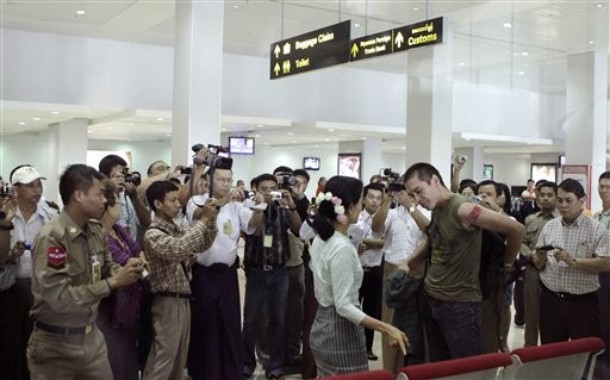 ရန္ကုန္ေလဆိပ္တြင္ ေတြ႔ရေသာ သားအမိ ၂ ဦး ႏွင့္ ၎တုိ႔ကုိ ၾကည့္ၿပီး ေပ်ာ္ရႊင္ေနသူ ပရိသတ္မ်ား (ဓာတ္ပုံမ်ား – AP)