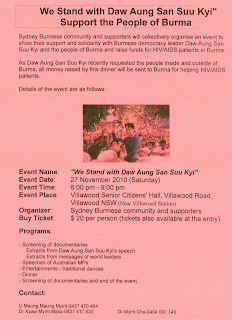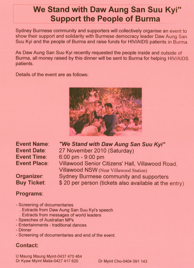 လာမည့္ ႏို၀င္ဘာ ၂၇၊ စေနေန႔မွာ ဆစ္ဒနီျမိဳ႔သူ ျမိဳ႔သားမ်ားရဲ့ ဆႏၵထုတ္ေဖာ္ပြဲမွာ “We Stand with Daw Aung San Suu Kyi” ေခါင္းစဥ္နဲ႔ အခမ္းအနားက်င္းပၾကျပီး ညစာစားပြဲနဲ႔ တည္ခင္းဧည့္ခံၾကမွာ ျဖစ္ပါတယ္။ အဆိုပါ ဂုဏ္ျပဳပြဲေတာ္ကို Villa Wood Center မွာ ျမန္မာ့အေရးလုပ္ေဆာင္သူ အစုအဖြဲ႔ေပါင္းစုံ၊ လူပုဂၢဳိလ္မ်ား စုေ၀းျပီး က်င္းပၾကတာျဖစ္ျပီး ျမန္မာ့အေရး ႏွီးေႏွာဖလွယ္ၾကမယ္လို႔လဲ သိရပါတယ္။