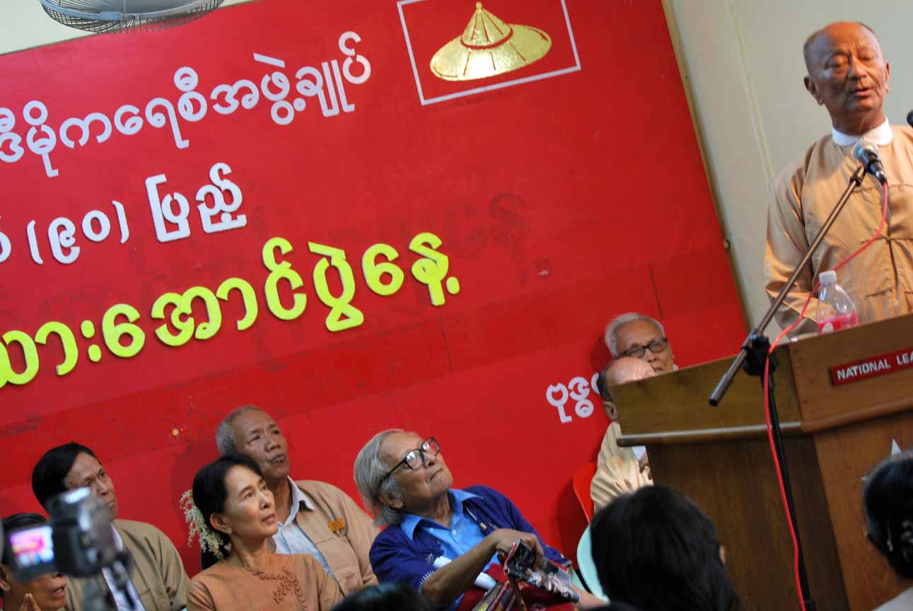(ဓာတ္ပုံမ်ား – ဒီ၁၊ ၂၀၁၀။ ရန္ကုန္ အင္န္အယ္ဒီရုံးခ်ဴပ္။ ႏွစ္ ၉၀ ျပည့္ အမ်ဴိးသားေန႔ အခမ္းအနား ျမင္ကြင္း။ (တာရာေ၀ယံ))