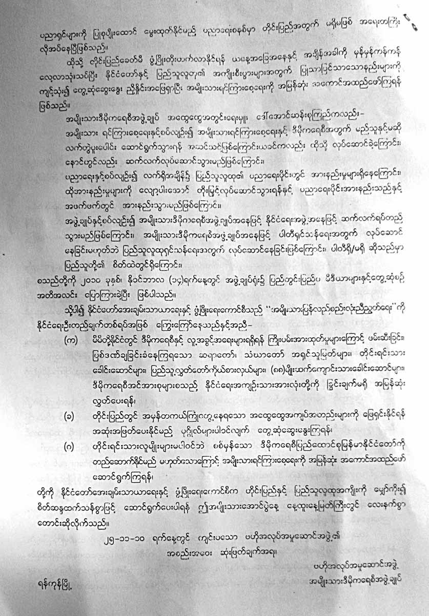 (၃) တိုင္းရင္းသားလူမ်ဴိးမ်ား မပါ၀င္ဘဲ စစ္မွန္ေသာ ဒီမိုကေရစီျပည္ေထာင္စု ျမန္မာႏိုင္ငံေတာ္ကို တည္ေဆာက္ႏိုင္မည္ မဟုတ္ေသာေၾကာင့္ အမ်ဴိးသားရင္ၾကားေစ့ေရးကို အျမန္ဆုံး အေကာင္အထည္ေဖာ္ ေဆာင္ရြက္ၾကရန္ တို႔ ေဖာ္ျပထားေၾကာင္း သတင္းရရွိပါတယ္။