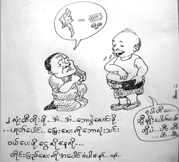 “ေဟ … တယ္စြမ္း တဲ႔ ၀ီကီလိ ပါလား” “စြမ္းတယ္ ဂ်ီးေဒၚေရ … ေတာ္ၾကာ … ျမန္မာတျပည္လံုးအား တရုတ္ လက္ထဲ သို႔ ႏွစ္က်ပ္ခြဲ ျဖင္႔ ေရာင္းခ်ရန္ ေစ်းဆိုင္ထားျခင္း … တို႔၊ ဧရာ၀တီ ျမစ္ၾကီး တရုတ္ျပည္သို႔ စီးဆင္းေစရန္ ျမစ္ေၾကာင္း ေရႊ႕ေျပာင္းမွဳ ဆိုင္ ရာ တရုတ္-ျမန္မာ ႏွစ္နိုင္ငံ (ျပည္သူ႔ ဆႏၵ ပါစရာမလို) သေဘာတူ စာခ်ဳပ္ လက္မွတ္ ေရးထိုး ျခင္း တို႔ …… ” “အမေလး… ေတာ္ပါေတာ႔ သာဂိရယ္။ ေသြးေတာင္ တိုးခ်င္ လာျပီ … ဂစ္ … ဂစ္… ဂစ္ …………” (နားထား)
