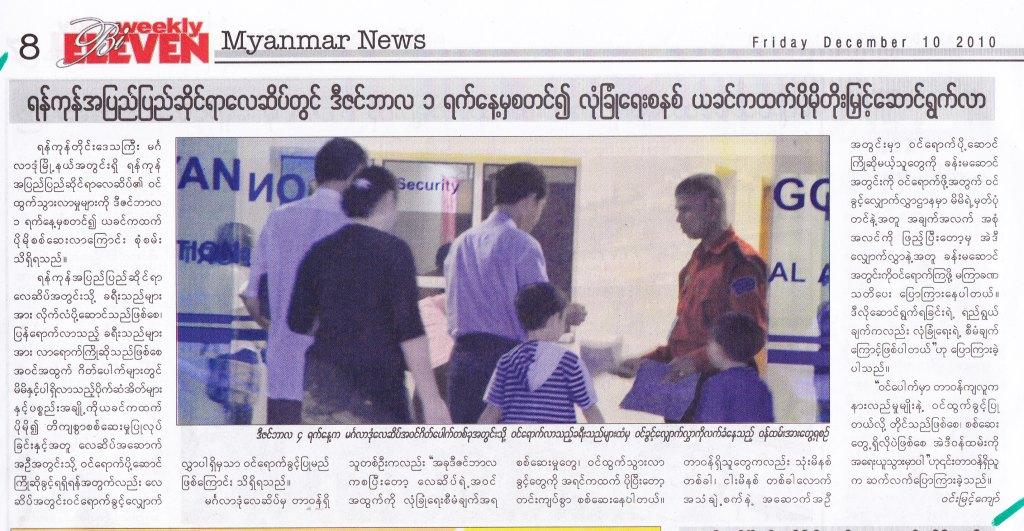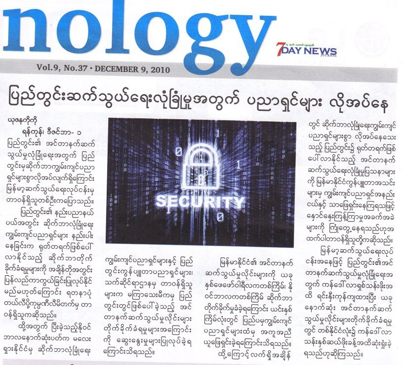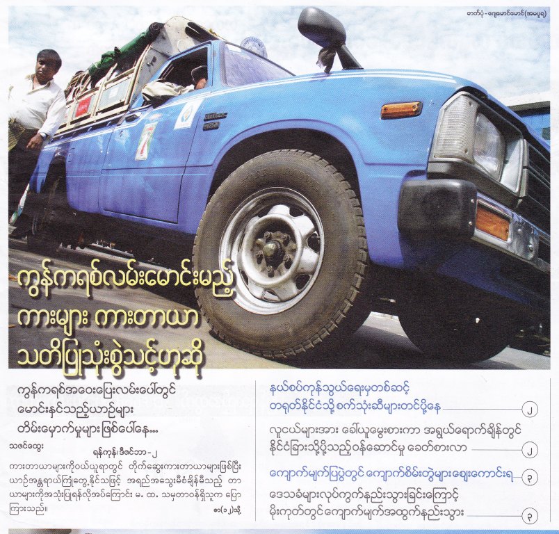 ဒီတပတ္ 7DAY (ဒီဇင္ဘာ ၉) မ်က္နွာဖုံးမွာပါလာတာက ကားတာယာနဲ႕ ကြန္ကရစ္လမ္း။ ဒီသတင္းက ဒီဂ်ာနယ္တေစာင္ထဲမဟုတ္ဘူးေနာ္ အေတာ္မ်ားမ်ားမွာပါလာတာ။ တျပိဳင္တည္းလုိလုိပါလာ တာ ဆုိေတာ့ တမင္ထည့္ခုိင္းတာ ျဖစ္နုိင္ေနျပီေလ။