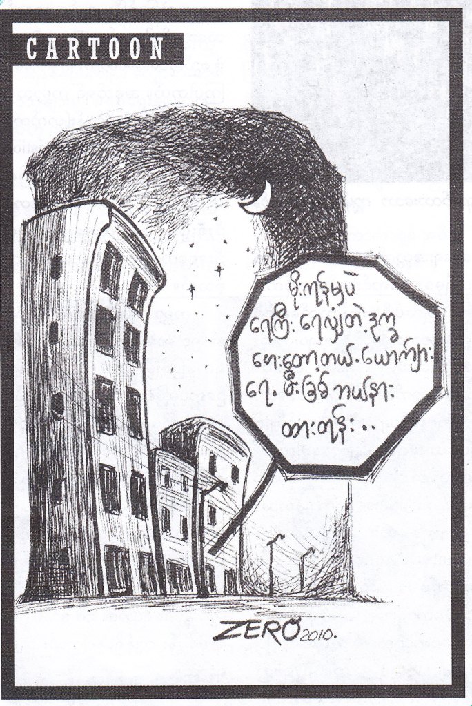 ဒီကာတြန္းအေၾကာင္းေတာ့ ရန္ကုန္သားေတြက သိပ္ သိတာေပါ့။ ႏုိင္ျခံငါး ေရာက္ေနတ့ဲသူေတြ ဒီကာတြန္းၾကည့္ၿပီး မ်က္ေမွာင္ႀကဳံ႕ေနမွာ စုိးလုိ႔ ရွင္းျပရမယ္ ဆုိရင္ –