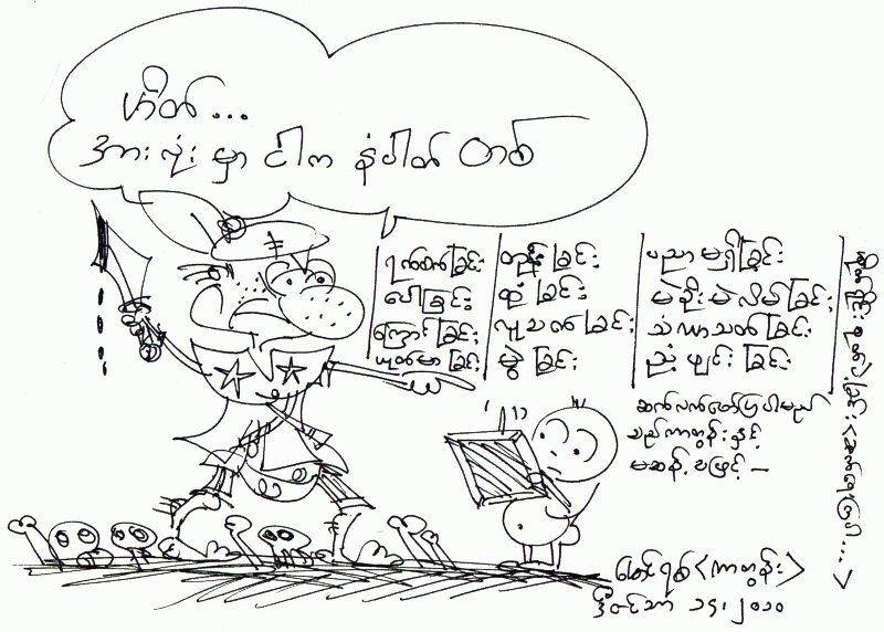 (ဟုတ္ပါ့မလား ေမာင္ကာဠဳရဲ႕၊ စစ္သားႏွင့္ မစစ္သားဝန္ထမ္းမ်ား လစာ စားေရရိကၡာ ေနစရာ ရာထူး ဘယ္ေလာက္ကြာတုန္း၊ မိုးနဲ႔ေျမ ေျမနဲ႔မိုး)