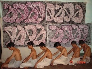 (ပန္းခ်ီ ထိန္လင္း၊ Ponsan Tain Assume The Position ၊ ရန္ကုန္ ဂြၽန္ ၂၀၀၅၊ Paintings approximately 70 in X 36 in in Rhodamine Power and Glue)