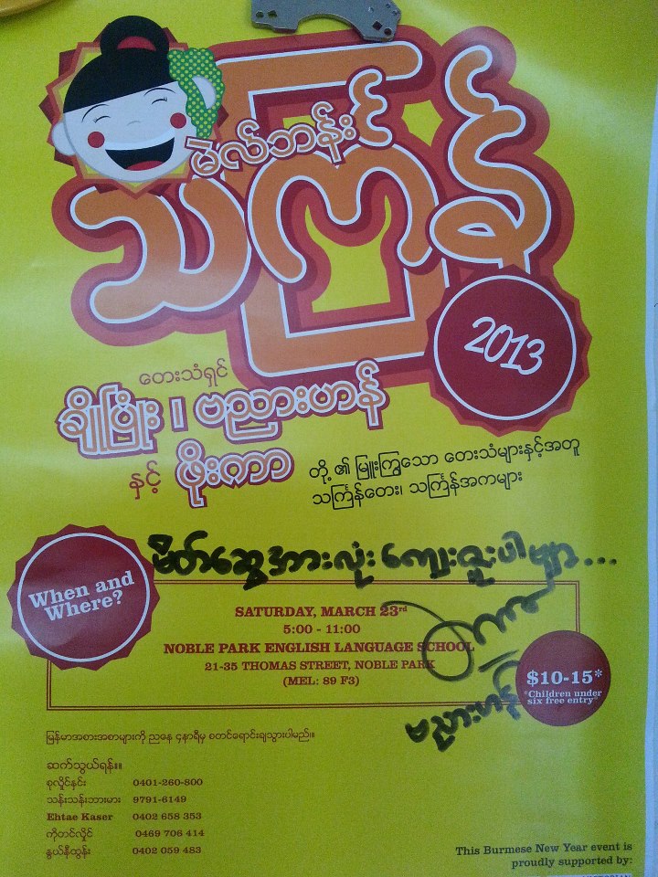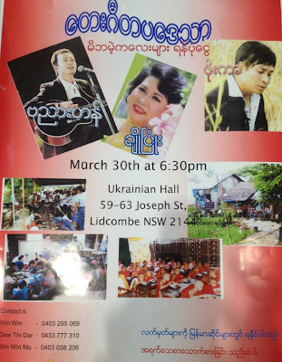 ဂီတပြဲ (၃)ပြဲထဲက ဆစ္ဒနီမွာလုပ္တဲ့ပြဲဟာ ျမန္မာျပည္က မိဘမဲ့ တိုင္းရင္းသားလူငယ္ဖြံၿဖိဳးေရးေက်ာင္းအတြက္ရည္စူးၿပီး လုပ္တဲ့ပြဲလို ့သိရပါတယ္။ အဲ့ဒ ီမိဘမဲ့ တိုင္းရင္းသားလူငယ္ဖြံ ့ၿဖိဳးေရးေက်ာင္းအတြက္ ရံပုံေငြဂီတပြဲကိုUkrainian Hall , 59 – 63 Joseph st, Lidcombe NSW 2144 ,Sydney မွာ မတ္ ၃၀၊ ၂၀၁၃ ေန ့က ျပဳလုပ္ခဲ့ၾကတာပါ။ ဒီပြဲျဖစ္ေျမာက္ေအာင္ ကမကထလုပ္သူေတြကေတာ့ စိုင္းထင္လင္းေသာင္း၊ မဝင္းဝင္း၊ မသီတာႏြယ္၊ မဝင္းဝင္းမူ၊ မစန္းစန္းေအးနဲ ့ သူငယ္ခ်င္းတစုပဲျဖစ္ပါတယ္။