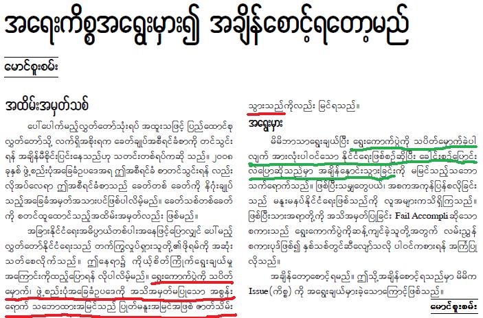 “ေရြးေကာက္ပဲြကုိ သပိတ္ေမွာက္ခ့ဲပါလ်က္ အားလုံးပါ၀င္ေသာ ႏုိင္ငံေရးျဖစ္စဥ္ ဆုိျပီး ေခါင္းစဥ္ ေျပာင္းလဲေျပာဆုိ” ေသာ္လည္း ေနာက္က်သြားျပီ၊ မွားသြားျပီဟု သုံးသပ္ထားသည္။