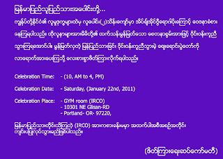 ဇန္န၀ါရီလ ၂၂ ရက္၊ စေနေန႔၊ နံနက္ ၁၀ နာရီက ၄ နာရီ အထိ 10301 NE Glisn Rd., Portland. Oregon 97220 ရွိ အားကစားခန္းမေဆာင္ (Gym Room, IRCO) တြင္ က်င္းပမည္ျဖစ္ပါ၍ ရပ္နီးရပ္ေ၀းရွိ အမိျမန္မာျပည္ခ်စ္သူ ျမန္မာမိသားစုမ်ားအားလုံးကို လႈိက္လွဲ ေႏြးေထြးစြာ ဖိတ္ေခၚထားသည္ကို ေတြ႔ရသည္။