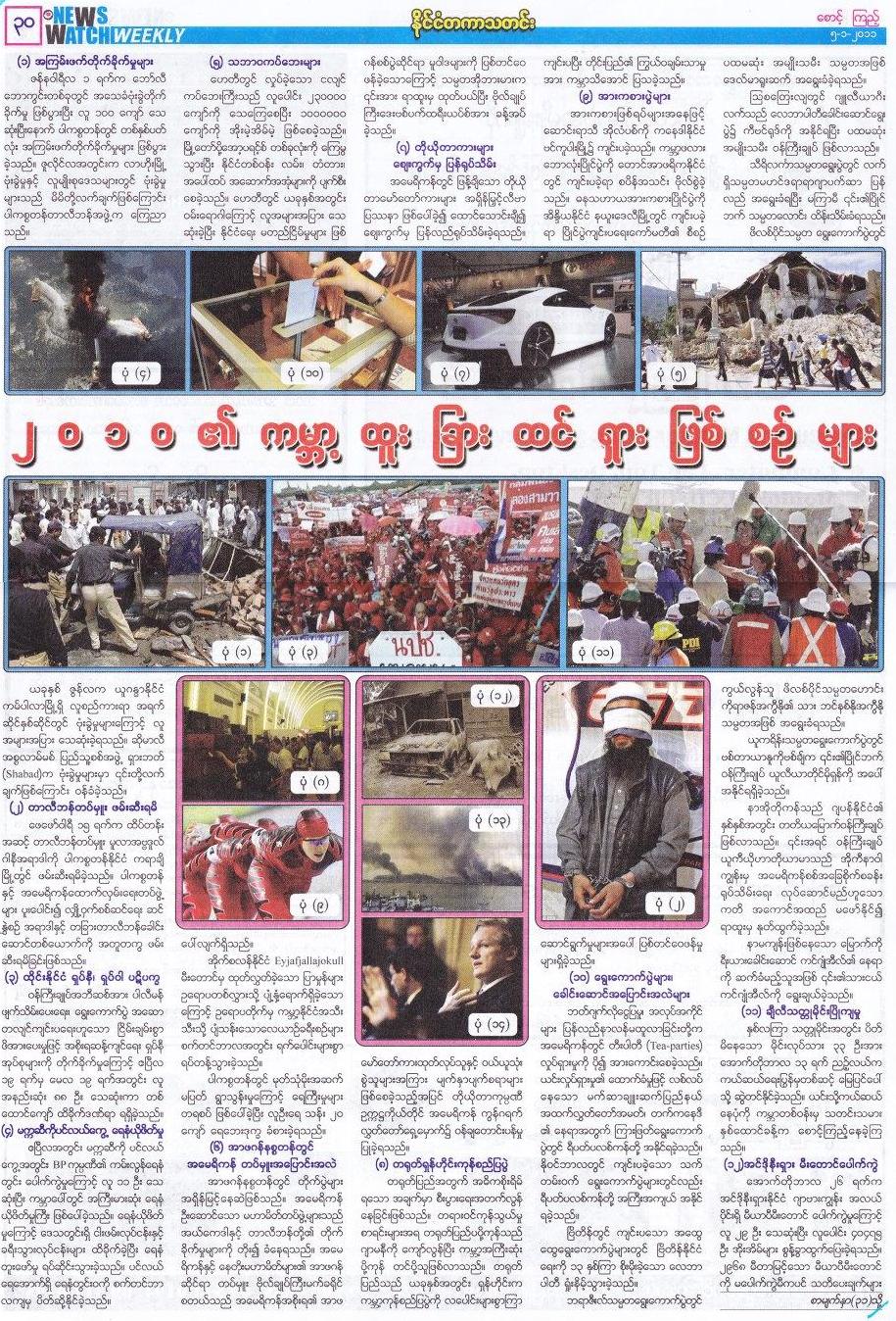 ေစာင့္ၾကည့္ဂ်ာနယ္က ျမင္တဲ့ ၂၀၁၀ ရဲ႕ ျမန္မာ့ထူးျခားထင္ရွားျဖစ္စဥ္မ်ား တဲ့။ ဂ်ာနယ္က မ်ားလာေတာ့ အျမင္ေတြကလဲ ကြဲျပားလာၾကတယ္။ တူတာေတြ ရွိသလုိ တျခားစီ ဖတ္ေကာင္းတာေတြလဲ ပါေနတာမုိ႕ အရသာတမိ်ဳးနဲ႕ ခံစားနုိင္ဖုိ႕ပါ ဖတ္ၾကည့္ပါဦး။