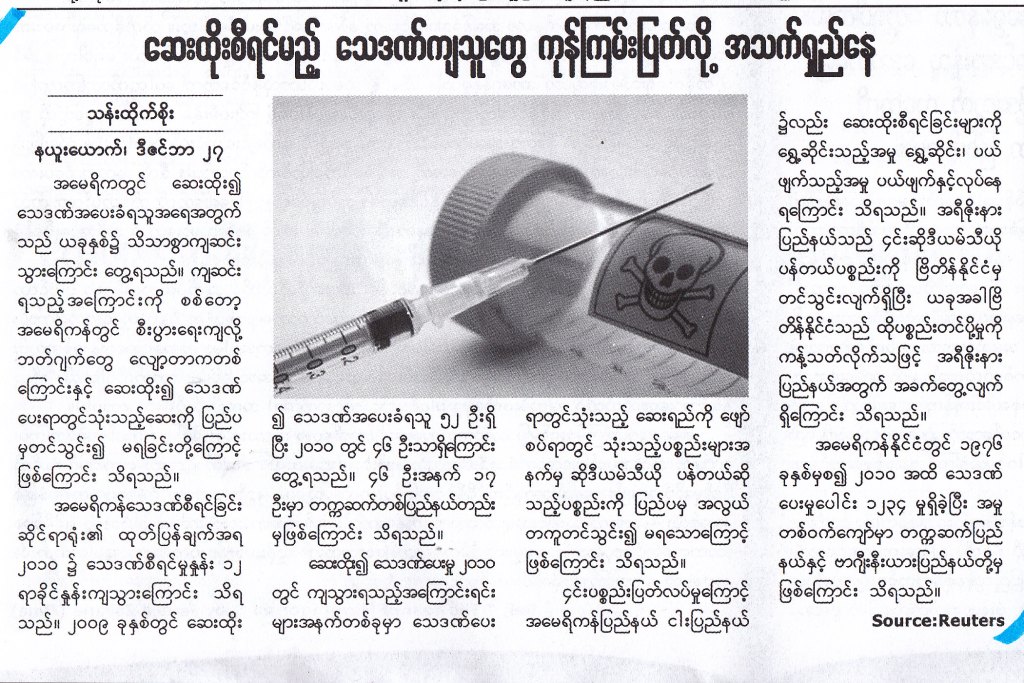 ေသဒဏ္က်တုိင္း ေသမယ္ မထင္ပါနဲ႕… ေဆးျပတ္ရင္လဲ အသက္က ရွည္ဦးမွာ…။ ဖတ္ၾကည့္ပါဦး… ရယ္ရမလုိ ငုိရမလုိ…။ အေမရိကမွာ ေဆးထုိးသတ္ဖုိ႕ရာကုိဘဲ ေဆးက ျပတ္ေနျပန္ေသးတဲ့ဗ်ာ…။