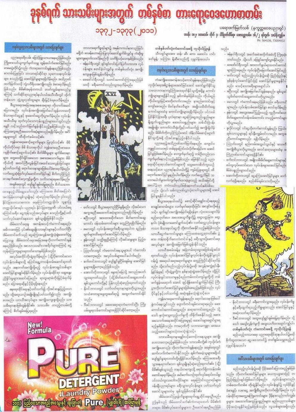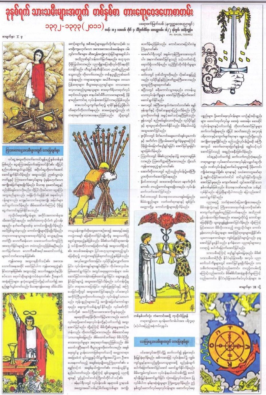 ေဗဒင္ဆုိ မွန္ေဘာင္ မလုပ္နဲ႕ဗ်…။ သူကလဲ စိတ္၀င္စားသူေတာ့ အမ်ားသား…။ ေအာင္မယ္… တႏွစ္စာ အလကား ဖတ္ရမွာေလ… “ခုႏွစ္ရက္ သားသမီးမ်ား အတြက္ တႏွစ္စာ တားေရာ့ေ၀ဒ ေဟာစာတမ္း” ပါတဲ့ဗ်ာ။