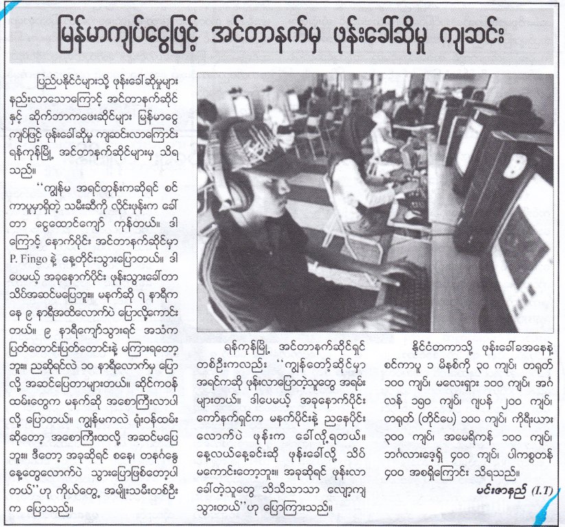 p…fingo က တကယ္ေတာ့ အခေၾကးေငြ နည္းနည္းနဲ႔ သံုးႏိုင္တဲ့ အင္တာနက္ ၀န္ေဆာင္မႈ တစ္မ်ိဳးေပါ့။ အင္တာနက္ကေဖး ေတြရဲ႕ ေဘာ္ခ်က္တဲ့… စီးပါြးေရးတမ်ိဳးေပါ့…။ စားသုံးသူေတြဘက္က ၾကည့္ေတာ့လဲ… သက္သက္သာသာနဲ႕ ျပည္ပေရာက္ မိသားစု၀င္ေတြဆီ ဆက္သြယ္ နုိင္တယ္ေလ။ ခုေတာ့… အဟက္ ခံရပါတယ္ ဆုိတဲ့ ပုံပ်က္ပန္းပ်က္ အင္တာနက္ေၾကာင့္ ကေဖးေတြလဲ ခါနာနိမ္း ေတာ့မယ္ဆုိပါလား…။