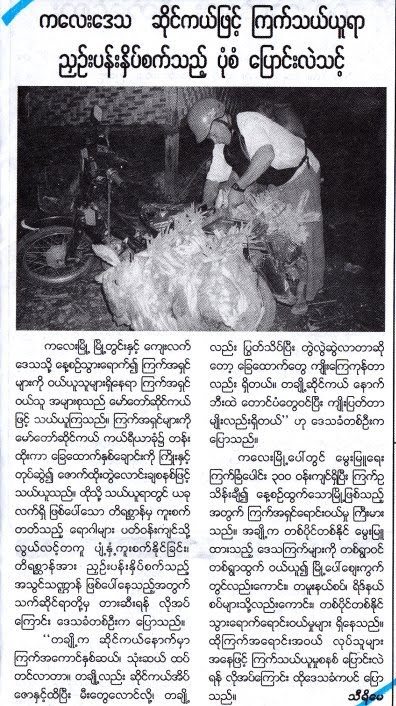 ကမာၻေပၚမွာ လူသားခ်င္း စာနာမႈမရွိ ႏွိပ္စက္ပါ၏… လုိ႕ ျမန္မာအပါအ၀င္ နုိင္ငံအေတာ္မ်ားမ်ား… မွာ တေၾကာ္ေၾကာ္ေအာ္ ေနသံေတြကုိၾကားေနၾကရမွာပါ…။ အဲသလုိ… လူေတြအတြက္ ေအာ္ေနေပမဲ့ တျခားသတၱ၀ါေတြအတြက္ေတာ့… ေမ့ေလ်ာ့… က်က်န္ေနခဲ့့ သလုိပါဘဲ…။ ဒီသတင္းမွာပါတဲ့ ျမင္ကြင္းမ်ိဳးကုိ ရန္ကုန္ျမိဳ႕က သိမ္ၾကီးေစ်း ေအ-ရုံတ၀ုိက္မွာ မျမင္ခ်င္မွ အဆုံးေပါ့…။