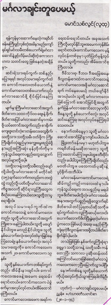 မဂၤလာခ်င္း တူေပမယ့္ ဆုိတဲ့ ေခါင္းစဥ္ေလးနဲ႕ အေျခခံ လူတန္းစားတုိ႕ ရဲ႕ ၇၀ ျပည့္ႏွစ္မ်ား ဆီက မဂၤလာပြဲေလးအေၾကာင္း ေရးထားတာေလးဗ်ာ.. တကယ္ပါ.. ဟတ္ထိတယ္..ဆုိတာ ဒါကုိေခၚတာေနမွာ.. ဖတ္ရတာ ရင္ထဲမွာ ဟာcနဲပါ..။ ခုေခတ္လဲ ဒီအတုိင္းဘဲ မေျပာင္းလဲ နုိင္ဘူး ထင္ပါတယ္ခင္ဗ်..
