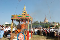 ယင္း အခမ္းအနား၏ ထူးျခားခ်က္မွာ ဆရာႀကီး အဘြားေဒၚသုေမဓာ (ခ) ေဒၚစိန္လင္းကို သက္ဆိုင္ရာ သန္လ်င္သုႆန္တြင္ မီးသၿဂႋဳဟ္ျခင္း မျပဳလုပ္ဘဲ ဆံေတာ္ရွင္ က်ဳိက္ေခါက္ ေစတီေတာ္ျမတ္ႀကီး၏ အေနာက္ဘက္ဝင္းတြင္ မီးသၿဂႋဳဟ္ျခင္း အခမ္းအနားကို စည္ကားသိုက္ၿမိဳက္စြာ က်င္းပႏိုင္ခဲ့ျခင္းျဖစ္သည္။ ယင္း မီးသၿဂႋဳဟ္ျခင္း အခမ္းအနားတြင္ ေလာင္ၿမိဳက္ေနေသာ မီးေတာက္မ်ား၊ မိုးယံသုိ႔ တက္သြားေသာ မီးခိုးေငြ႔မ်ား၊ ေလာင္ကၽြမ္းသြားေသာ ႐ုပ္ခႏၶာတုိ႔၏ အေနာက္ဘက္ ခပ္လွမ္းလွမ္းတြင္ ဖူးေျမာ္လိုက္ရေသာ ေစတီေတာ္တို႔ကို ျမင္ေတြ႔လိုက္ရသည္ႏွင့္ . . .