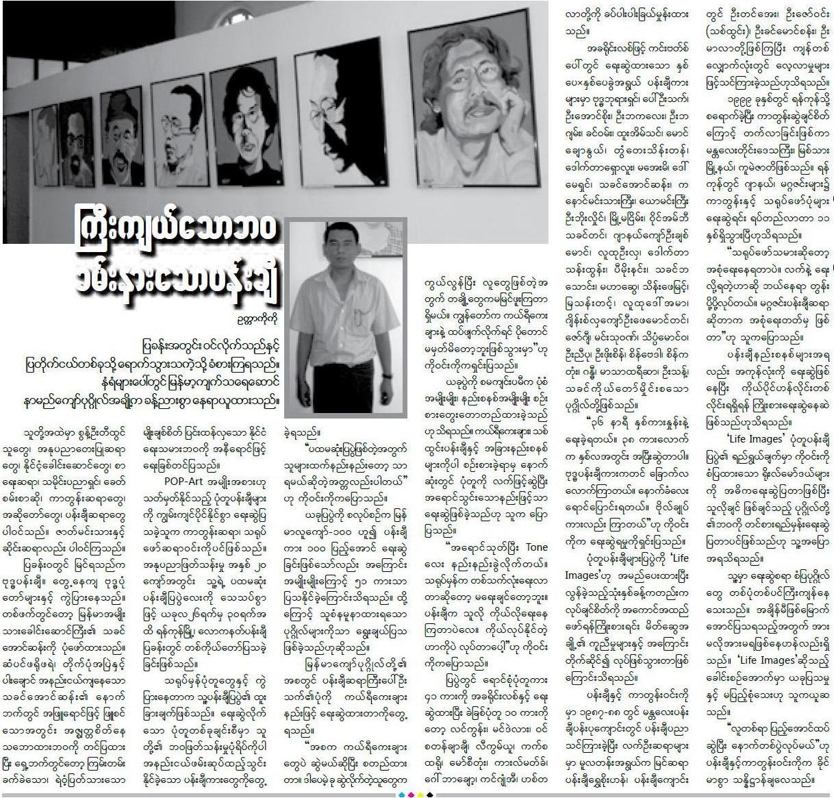 ျမစ္သားဇာတိ၊ ၁၉၈၇-၈၈ မႏၱေလး ပန္းခ်ီပန္းပုေက်ာင္းသား၊ လက္ရိွ ပန္းခ်ီ ကာတြန္းေရးဆဲြသူ ၀င္းကုိရဲ႕ ထူးျခားတ့ဲ ျပပဲြအေၾကာင္းကုိ ေရးထားတာ အင္မတန္ စိတ္၀င္စားဖုိ႔ ေကာင္းပါတယ္။