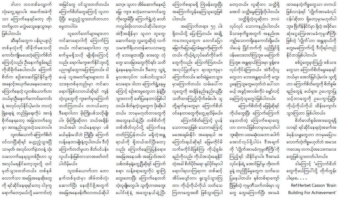 ငယ္ကတည္းက ပါလာတ့ဲ ေၾကာက္စိတ္အေၾကာင္း ေဆာင္းပါး။ အရမ္း ေကာင္းပါတယ္။ ျမန္မာျပည္မွာ ဒီစိတ္က အသားက်ေနၾကေတာ့ ဒါမ်ဳိးေတြ ဖတ္ရတာ သင့္ေတာ္ပါတယ္။ ေဆာင္းပါးတုိမုိ႔ တထုိင္တည္း ဖတ္ျဖစ္ၾကပါလိမ့္မယ္။