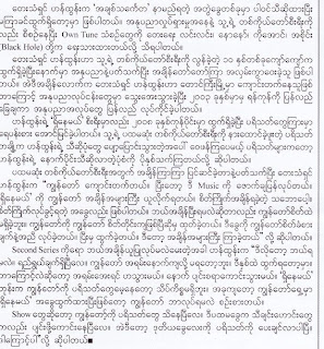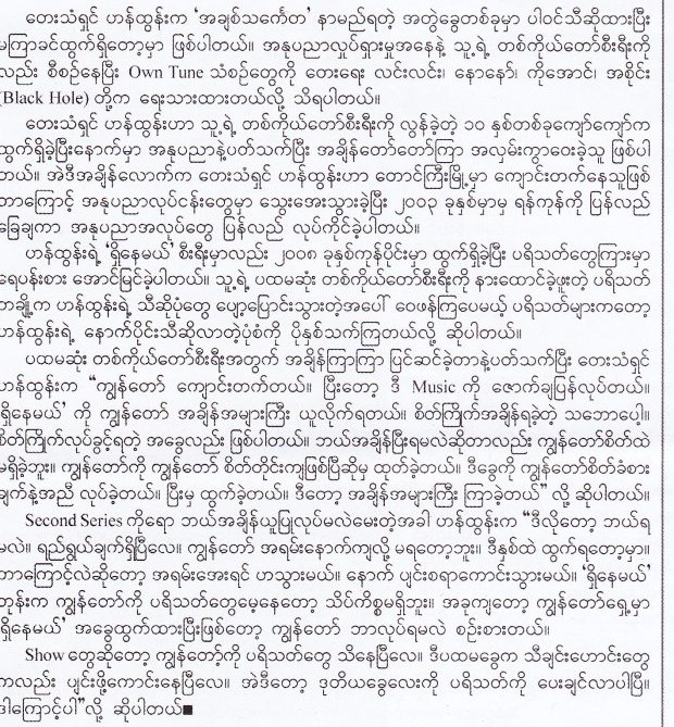 ဒီ News ကုိ ေရးသူက English စာ Good ပုံ ရပါတယ္။ ဥပမာ – ပထမစာပုိဒ္မွာ “Own Tune သံစဥ္” လုိ႔ ေရးထားပါတယ္။ အုန္းကြ်န္းသံစဥ္ ဆုိေတာ့ အုန္းကြ်န္းမွာ ေရးတ့ဲ သီခ်င္းေတြျဖစ္မလားလုိ႔ ေနာက္ေျပာင္ခ်င္စရာ။