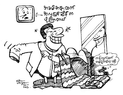 “ဂ်ီးေဒၚမေျပာနဲ႔ လႊတ္ေတာ္တြင္း နိုင္ငံေရး လုပ္မဟဲ႔ လို႔ ေမာင္းတင္ထားတဲ႔ တခ်ဳိ႕ အမတ္မင္းၾကီးေတြေတာင္ လႊတ္ေတာ္ထဲက သူတို႔ အာဏာ မိုက္ေၾကးခြဲပြဲၾကီးထဲမွာ ထိုင္ ငိုက္ေနရတာ စိတ္ကုန္ေနရွာျပီ တဲ႔”