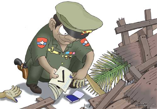 နာဂစ္ေဒသတြင္ အာဏာပုိင္တုိ႔က ကယ္ဆယ္ေရးလုပ္ငန္းကုိ ဦးစားမေပးဘဲ အေျခခံဥပေဒအတည္ျပဳေရးအတြက္ ေထာက္ခံမဲရရန္ ႀကိဳးပမ္းခ့ဲပုံကုိ ကာတြန္းဆရာတဦးက အထက္ပါအတုိင္း သရုပ္ေဖာ္ခ့ဲသည္။
