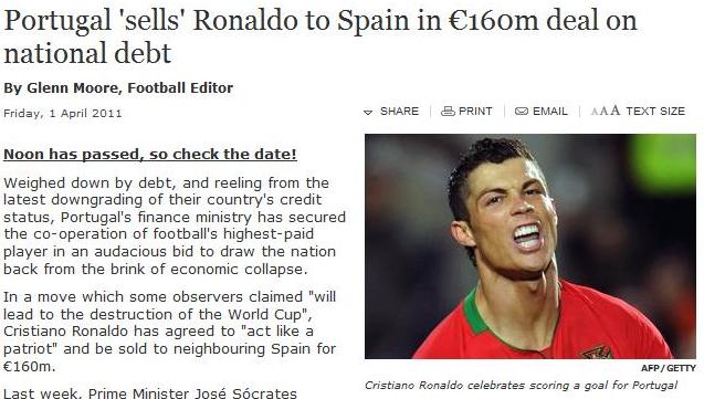 လန္ဒန္အေျခစုိက္ The Independent သတင္းစာတြင္လည္း ဧပရယ္ဖူး ယဥ္ေက်းမႈကုိ ေတြ႔ႏုိင္သည္။ ေပၚတူဂီက ႏုိင္ငံတြင္ တင္ရိွေနေသာ အေၾကြးမ်ား ေၾကေစရန္ ကမၻာေက်ာ္ ေဘာ္လုံးသမား Cristiano Ronaldo ကုိ စပိန္ႏုိင္ငံသုိ႔ ေရာင္းခ်လုိက္သည္ဟူ၍ ေရးသားထားသည္။
