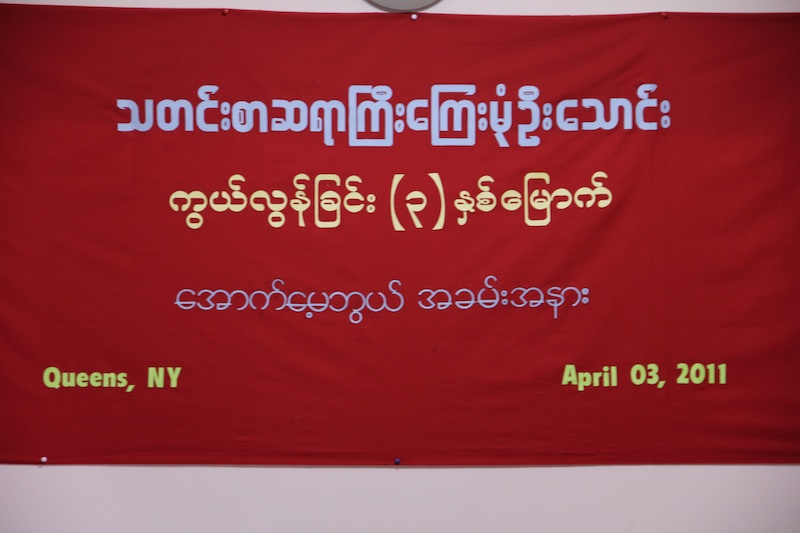 ဧျပီလ ၃ ရက္၊ တနဂၤေႏြေန႔က နယူးေယာက္ျမိဳ႔ေတာ္၊ ၀ုုဒ္ဆိုုက္ဒ္၊ မဟာေအာင္ေျမဘုုန္းၾကီးေက်ာင္း ခန္းမမွာ အခမ္းအနားကိုု က်င္းပခဲ့ပါတယ္။ ပရိသတ္ စာေပခ်စ္သူ ၅၀ ဦးေက်ာ္ တက္ေရာက္ပါတယ္။