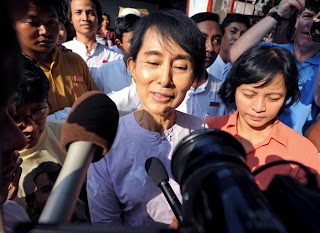 ရုံးအျပင္ဘက္တြင္ သတင္းေထာက္တုိ႔၏အေမးကုိ ေျဖၾကားေနေသာ ေဒၚေအာင္ဆန္းစုၾကည္