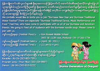 ဧျပီ ၃၀ မွာ ေအာရီဂြန္ျပည္နယ္ေရာက္ မ်ဴိးဆက္သစ္ျမန္မာလူငယ္ေတြရဲ့ သၾကၤန္ပြဲ စည္ကားတယ္လို႔ သိရပါတယ္။ လူၾကီးသူမမ်ားကို သက္ၾကီးပူေဇာ္ပြဲ က်င္းပျခင္း၊ ေရႊပြဲလာမ်ားကို မုန္႔ဟင္းခါး စတုဒီသာ ေကၽြးျခင္းနဲ႔ ေစတနာရွင္မ်ားကလည္း တတပ္တအား ရိုးရာစားဖြယ္မ်ား ယူေဆာင္ေကၽြးေမြး ကုသိုလ္ယူၾကပါတယ္။ ဧည့္ပရိသတ္ ၆၀၀ ေက်ာ္ လာတယ္လို႔ ဆိုပါတယ္။ ေအာက္ေျခက ဗီဒီယိုမွတ္တမ္း ယူက်ဳမွာ တင္ထားပါတယ္။ (သတင္းေပးပို႔သူ – မိုးမခမိတ္ေဆြ ကိုထြန္းထြန္း)