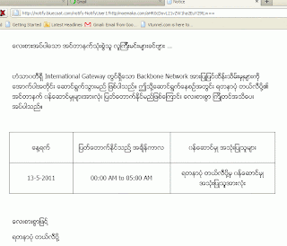အဆိုပါ အသိေပးေၾကညာခ်က္တြင္ ဟံသာ၀တီရွိ အင္တာေနရွင္နယ္ ဂိတ္ေ၀း၏ ပင္မေက်ာရိုးလိုင္း (back bone network) မ်ားျပဳျပင္ရန္ရွိသည့္အတြက္ ည သန္းေခါင္မွ နံနက္ ၅ နာရီထိ အင္တာနက္ျပတ္ေတာက္လိမ့္မည္ ဟု အသိေပးထားခဲ့သည္။ ထိုအသိေပး ေၾကညာခ်က္ ေပၚထြက္လ်က္ရွိသည့္ ယမန္ေန႔တေန႔လံုး ဧရာ၀တီ၊ မဇၥ်ိမ၊ ဒီဗြီဘီ အစရွိသည့္ ျပည္ပသတင္းဌာန ၀က္ဆိုက္မ်ားႏွင့္ သတင္းဌာနအခ်ိဳ႕၏ ၀က္ဆိုက္မ်ားပါ တိုက္ရိုက္ ၾကည့္ရႈႏိုင္ခဲ့ျခင္း ျဖစ္သည္။