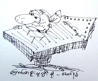 ၆။ ထိုေသာ … ကာလ … ထိုဘဝ၌ … အူေၾကာင္အူၾကား ကိုယ့္ဘာသာစကားကိုမွ် … အဓိပၸာယ္ နားမလည္ … အမိန္႔ေတာ္ ေပါက္ကရ … ထုတ္တတ္လွေသာ … “လြတ္ၿငိမ္းခ်မ္းသာခြင့္” ဆိုတာ ဘာမွန္း မသိရွာထေသာ ႐ူးေပါသြပ္ႏွမ္း … သမၼတလူၾကမ္းအဖြဲ႔မွ အကန္းမ်ားႏွင့္ အဖူးရေစ …။