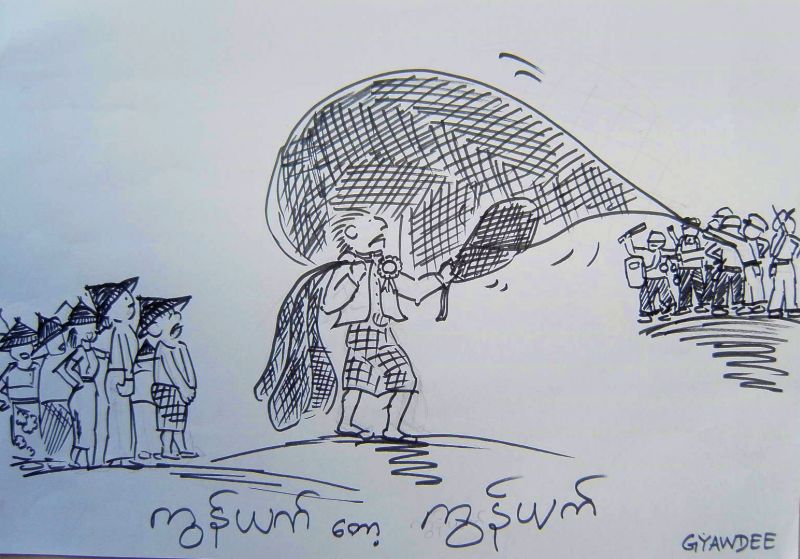 “ေအးဗ်ာ၊ ရပ္ရြာ တည္ျငိမ္ေအးခ်မ္းေရးဆိုတဲ့ စကားလံုးၾကီးကေတာ့ သူတို႔ လိုရင္လိုသလို အဓိပၸါယ္ဖြင့္လို႔ရတဲ့ စကားလံုးၾကီးကိုျဖစ္လို႔။ တရားဥပေဒစိုးမိုးေရး၊ ရပ္ရြာတည္ျငိမ္ေအးခ်မ္းေရး၊ အခ်ဳပ္အျခာ အာဏာတည္တံ့ခိုင္ျမဲေရးဆိုတာ သူတို႔ အေရးယူခ်င္တဲ့အခါ ယူနိုင္ေအာင္ အရွင္ထားတ့ဲ စကားလံုးေတြပါဗ်ာ။ ေဒၚစုနယ္ခရီးထြက္ရင္ လူထုက တခဲတနက္ၾကိဳဆိုၾကေတာ့မယ္။ ဒါကို သူတို႔ေၾကာက္လို႔ ၾကိဳကာေတြ လုပ္ေနတာ”