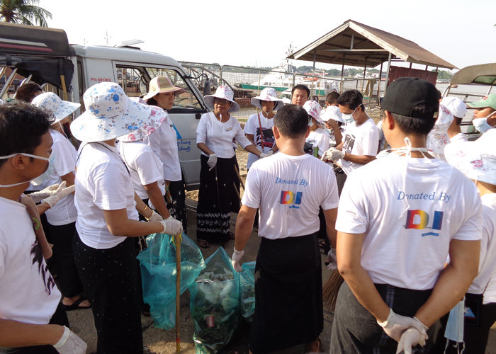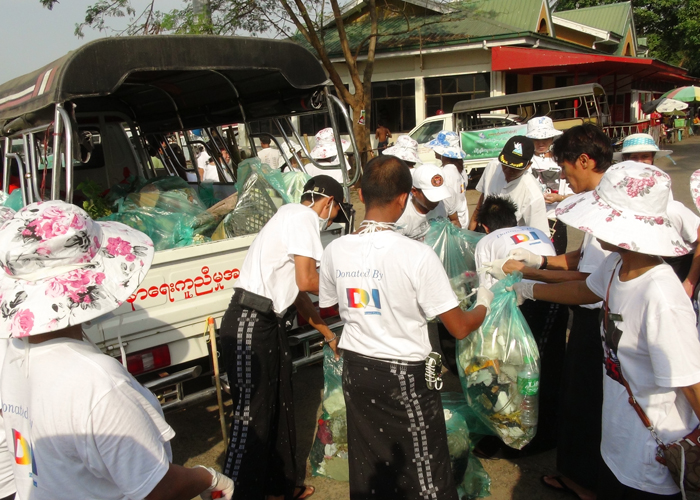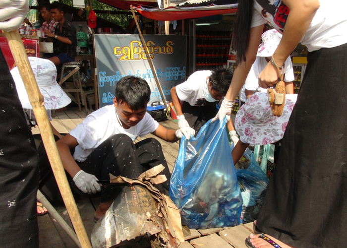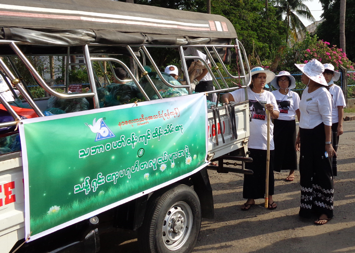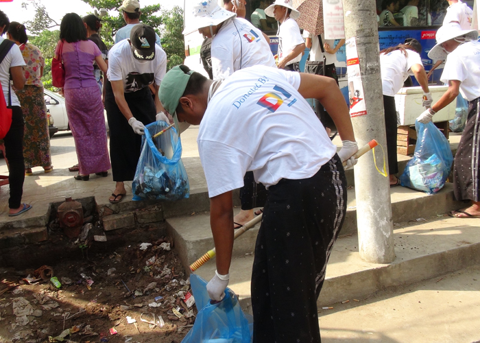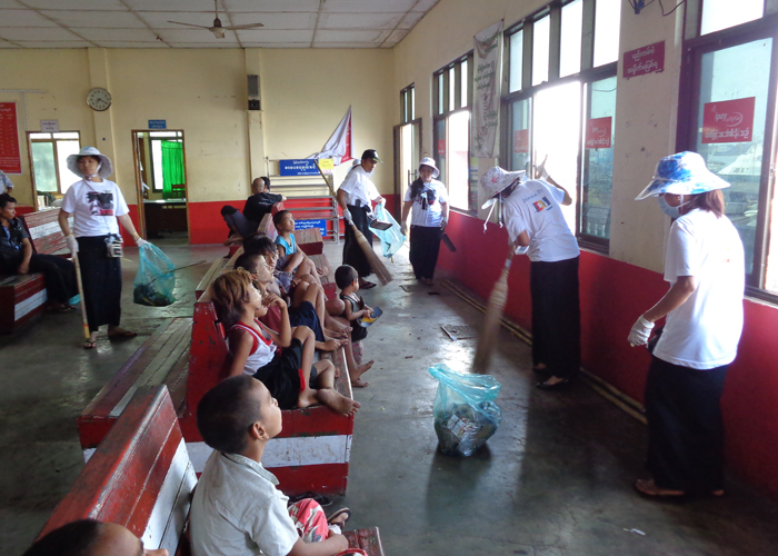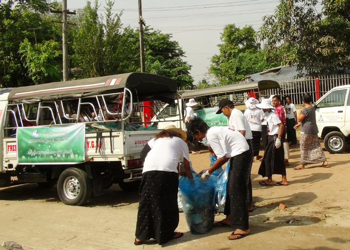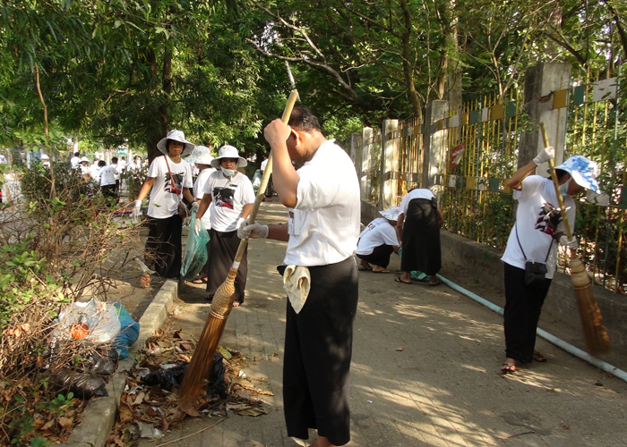 ၁၁.၅.၂ဝ၁၃ ရက္ေန႔ နံနက္ (၆းဝဝ) နာရီအခ်ိန္တြင္ နာေရးကူညီမႈအသင္း(ရန္ကုန္)မွ ဒု-ဥကၠဌ ေဒၚသန္းျမင့္ေအာင္ ဦးေဆာင္၍ သဘာဝပတ္ဝန္းက်င္အား ခ်စ္ျမတ္ႏိုးေသာ “သဘာဝပတ္ဝန္းက်င္ ထိန္းသိမ္းေရးႏွင့္ သန္႔ရွင္းေရးလူငယ္အဖြဲ႔” အား နာေရးကူညီမႈအသင္း(ရန္ကုန္)႐ွိ လုပ္အားေပး အသင္း သား/သူ (၄၆) ဦးတို႔သည္ ရန္ကုန္ၿမိဳ႕ လူစည္ကားရာေနရာျဖစ္သည္ ပန္းဆိုးတန္းဆိပ္ကမ္း ဧရိယာ အတြင္းရွိ ခရီးသည္နားေနေဆာင္ႏွင့္ ဆိပ္ခံေဗာတံတားႏွင့္ အနီးပတ္ဝန္းက်င္မ်ားတို႔တြင္ စည္းကမ္းမဲ့စြာ စြန္႔ပစ္ထားေသာ အမႈိက္မ်ားအား လိုက္လံေကာက္ယူသိမ္းဆည္းျခင္း၊ တံျမတ္စည္းလွည္းျခင္း၊ အမႈိက္ မ်ား စနစ္တက် ခြဲျခားထုတ္ပိုးျခင္းမ်ား ေဆာင္ရြက္ခဲ့ၾကၿပီးေနာက္ ေျမာက္ဥကၠလာပၿမိဳ႕နယ္ လူစည္ကား သည့္ ေျမာက္ဥကၠလာပအဝိုင္း ကားမွတ္တိုင္အနီး ပတ္ဝန္းက်င္မ်ားတြင္လည္း အမႈိက္မ်ားေကာက္ယူ သိမ္းဆည္းျခင္းမ်ားကို ဆက္လက္လုပ္ေဆာင္ခဲ့ၾကသည္။ ယခုကဲ့သို႔ လုပ္ေဆာင္ၾကရာတြင္ မိမိတို႔အေန ျဖင့္ အမ်ားျပည္သူတို႔ထံမွ အားတက္ဖြယ္ရာ ရလာဒ္ေကာင္းမ်ားကို ျမင္ေတြ႔ၾကားသိခဲ့ရပါေတာ့သည္။ ပန္းဆိုးတန္းေဗာတံတားေပၚတြင္ ေဈးသည္အခ်ိဳ႕သည္ မိမိတို႔အမႈိက္ေကာက္၊ တံျမတ္စည္းလွည္းေန သည္ကို ေတြ႔ျမင္ၾကေသာအခါ ၎တို႔၏ ေဈးဗန္းအနီးရွိ ၎တို႔စြန္ပစ္ထားေသာ အမိႈက္မ်ားကို တာဝန္ သိစြာ ျပန္လည္ေကာက္ယူေနသည္ကို ေတြ႔ျမင္ၾကရသလို အခ်ိဳ႕မွာ မိမိတို႔စားၿပီး လႊတ္ပစ္လိုက္ေသာ ကၽြတ္ကၽြတ္အိတ္ အမႈိက္မ်ားကို ခ်က္ခ်င္းျပန္လည္ေကာက္ယူကာ အမႈိက္ပံုးထဲသို႔ စနစ္တက်ျပန္လည္၍ စြန္႔ပစ္ေနၾကသည္ကို အားရေက်နပ္ဖြယ္ ေတြ႔ျမင္ခဲ့ရသည္။ အခ်ိဳ႕သူမ်ားမွာေတာ့ အမိႈက္ေကာက္ေန သည္ကို ပါဝင္ပူးေပါင္းလိုေသာ ဆႏၵရွိေသာ္လည္း ၎တို႔၏စိတ္ထဲတြင္ “သူတို႔လုပ္ေနတာျမင္မွ ငါ … ဝင္ လုပ္မယ္ဆိုရင္ ႐ွက္စရာ” ဟူေသာ အၾကည့္မ်ိဳးျဖင့္ ၾကည့္ေနၾကသည္ကိုလည္း ေတြ႔ျမင္ခဲ့ရသည္။ မည္သို႔ ပင္ျဖစ္ေစ ပူးေပါင္းပါဝင္လိုစိတ္ ေပၚေပါက္ခဲ့ျခင္းပင္ ကၽြန္ေတာ္တို႔၏ ျမန္မာလူမ်ိဳးတို႔သည္ အျခားေသာ ႏိုင္ငံႀကီးသားမ်ားထက္ တာဝန္ယူလိုစိတ္မညံ့ေသာ လူမ်ိဳးမ်ားဟု ေတြးျမင္မိေတာ့သည္။ “သဘာဝ ပတ္ ဝန္းက်င္ထိမ္းသိန္းေရးႏွင့္ သန္႔ရွင္းေရးလူငယ္အဖြဲ႔” သည္ နံနက္ (၁ဝး၃ဝ) နာရီအခ်ိန္၌ သန္႔ရွင္းေရး အစီအစဥ္ၿပီးဆံုး၍ နာေရးကူညီမႈအသင္း(ရန္ကုန္)သို႔ ျပန္လည္ေရာက္ရွိခဲ့ၾကၿပီး မိမိတို႔သိမ္းဆည္းခဲ့ေသာ အမိႈက္မ်ားအား ေျမာက္ဒဂံုၿမိဳ႕နယ္႐ွိ ထားဝယ္ေခ်ာင္ သုႆန္အနီး႐ွိ အမႈိက္ပံုသို႔ စနစ္တက်သြားေရာက္ စြန္႔ပစ္ခဲ့ၾကသည္။