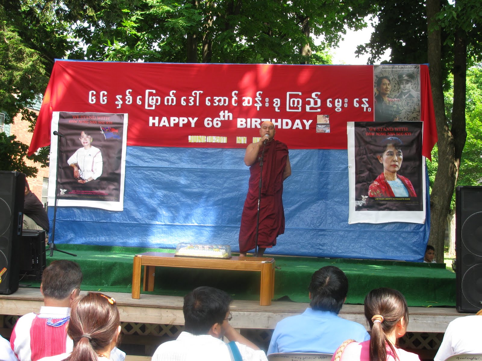 ဇြန္ ၁၈ ၂၀၁၁ေန႔က နယူးေယာက္ၿပည္၊ ယူတီကာၿမဳိ ့သႏသုခေက်ာင္းတုိက္တြင္ ေဒၚေအာင္ဆန္းဆန္းစုၾကည္႔ ၆၆ ႏွစ္ေၿမာက္ေမြးေန႔ပြဲကုိ စည္ကားသုိက္ၿမဳိက္စြာက်င္းပခဲ့ပါသည္။ နံနက္ပုိင္းတြင္ သံဃာေတာ္အရွင္ၿမတ္မ်ားအား ဆြမ္းကပ္လွဴဒါန္းၾကၿပီး ပရိတ္တရားေတာ္မ်ားနာယူၾကပါသည္။