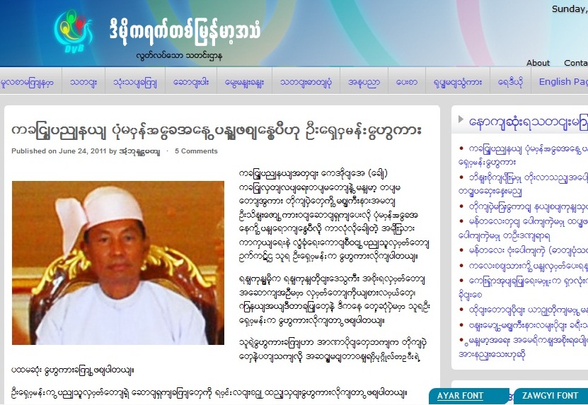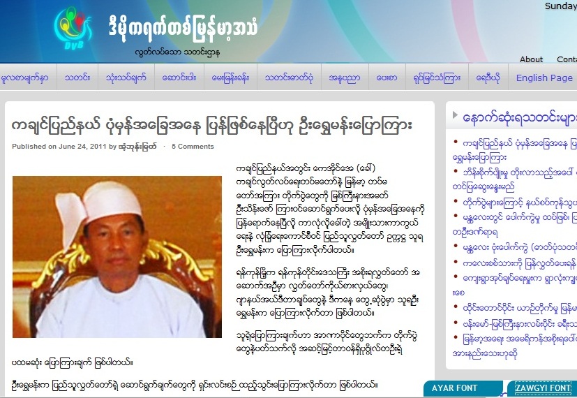 ၿပီးခ့ဲသည့္ ရက္ပုိင္းအတြင္း DVB သတင္းဌာန အင္တာနက္ စာမ်က္ႏွာကုိ ဧရာ၊ ေဇာ္ဂ်ီ၀မ္း တုိ႔ တပ္ဆင္လုိက္သည္ကုိ ေတြ႔ရသည္။ ယခင္က DVB သတင္းဌာန သုံးခ့ဲသည့္ စာလုံးမွာ ၀င္းဘားမိစ္ ျဖစ္သည္။