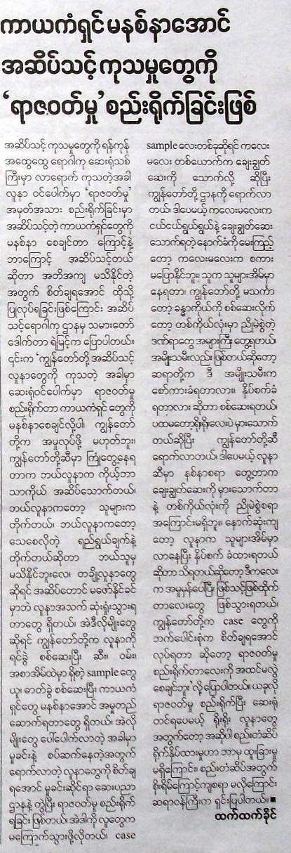 ျပည္သူ႔ေခတ္ရဲ႕ ပင္တုိင္ေဆာင္းပါးရွင္ မုိးေျပး ေရးထားတာ ဖတ္ၾကည့္ပါအုံး။ သူျမင္ေနရတာေတြကုိ ရုိးရုိးေလး ေရးထားတာ ဖတ္လုိ႔ အင္မတန္ အဆင္ေျပပါတယ္။