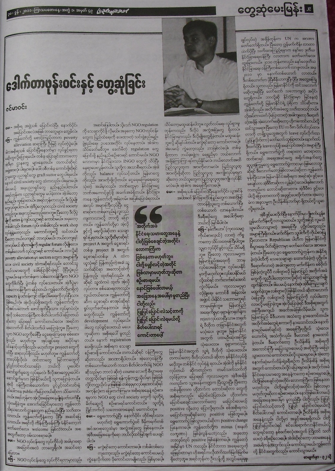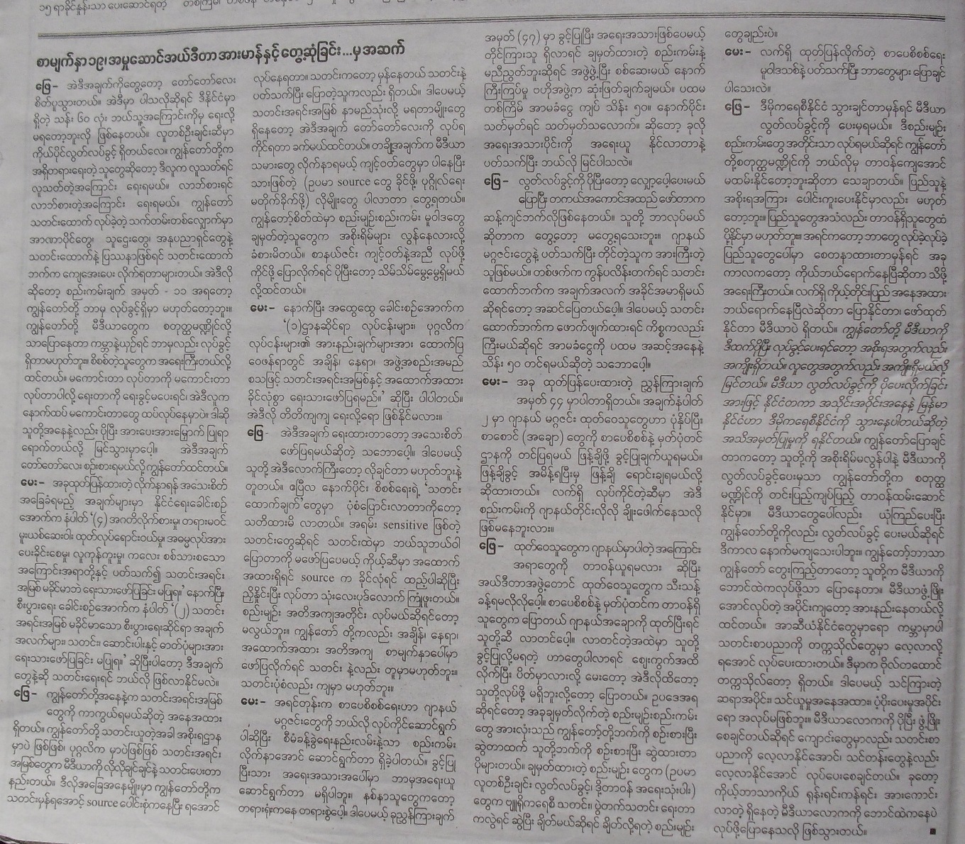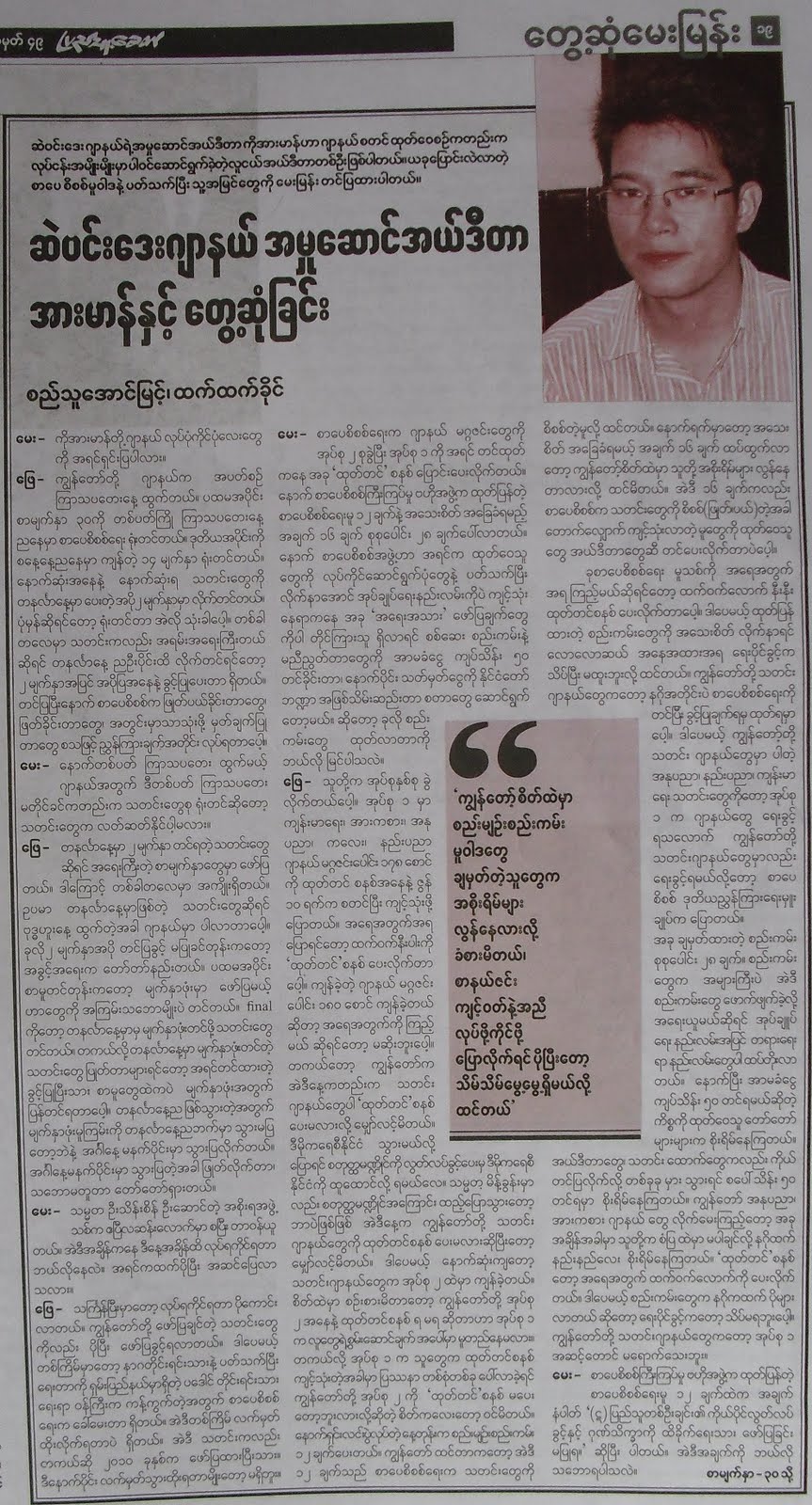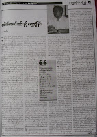 ဂ်ာနယ္တခု အပတ္စဥ္ ပုံမွန္ထြက္ေရးအတြက္ စိစစ္ေရးရုံးဆုိတ့ဲ မေကာင္းဆုိး၀ါးဌာနကုိ သြားေနရတာ အလုပ္ပ်က္လွတယ္ ဆုိတာ ဖတ္ေစခ်င္လုိ႔ ဒီအင္တာဗ်ဴး ကူးေပးလုိက္ပါတယ္။ ဖတ္ပါအုံး။