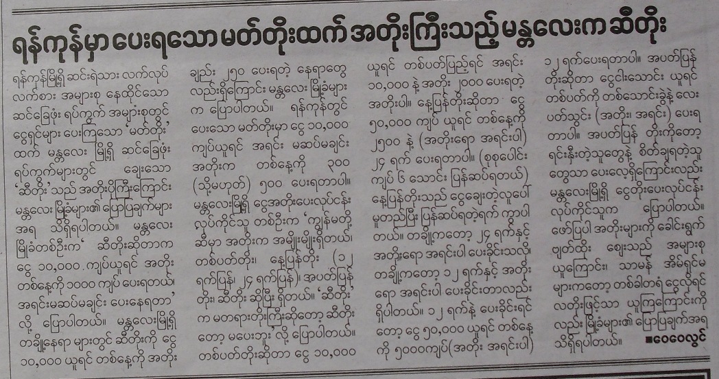 ေခါင္းစည္းတခုကုိ အၾကမ္း ခ်ေရးျပီး ျဖဳတ္လုိ႔ရတ့ဲ စာလုံးကုိ ျဖဳတ္လုိက္တာဟာ ေခါင္းစဥ္ ေပးနည္းမဟုတ္လား။ ေရႊေစ်းတက္တယ္လုိ႔ ေျဗာင္ေရးခြင့္မရိွဘူး ဆုိတာ ေခတ္ကုန္ပါျပီ။ စာေပစိစစ္ေရးက ငနဲေတြလည္း ဒါမ်ဳိးေတြကုိ လႊတ္ေပးေနတာပဲ။ သတင္း အစျပဳထားတာကုိက ေရႊေစ်းတက္တယ္ တ့ဲ။ သတင္းကုိေတာ့ လုိတုိရွင္းနဲ႔ အစျပဳျပီး ေခါင္းစည္းမွာ ေပရွည္ေနတာက အျမင္ကပ္စရာျဖစ္ေနပါအုံးမယ္ခင္ဗ်ာ။