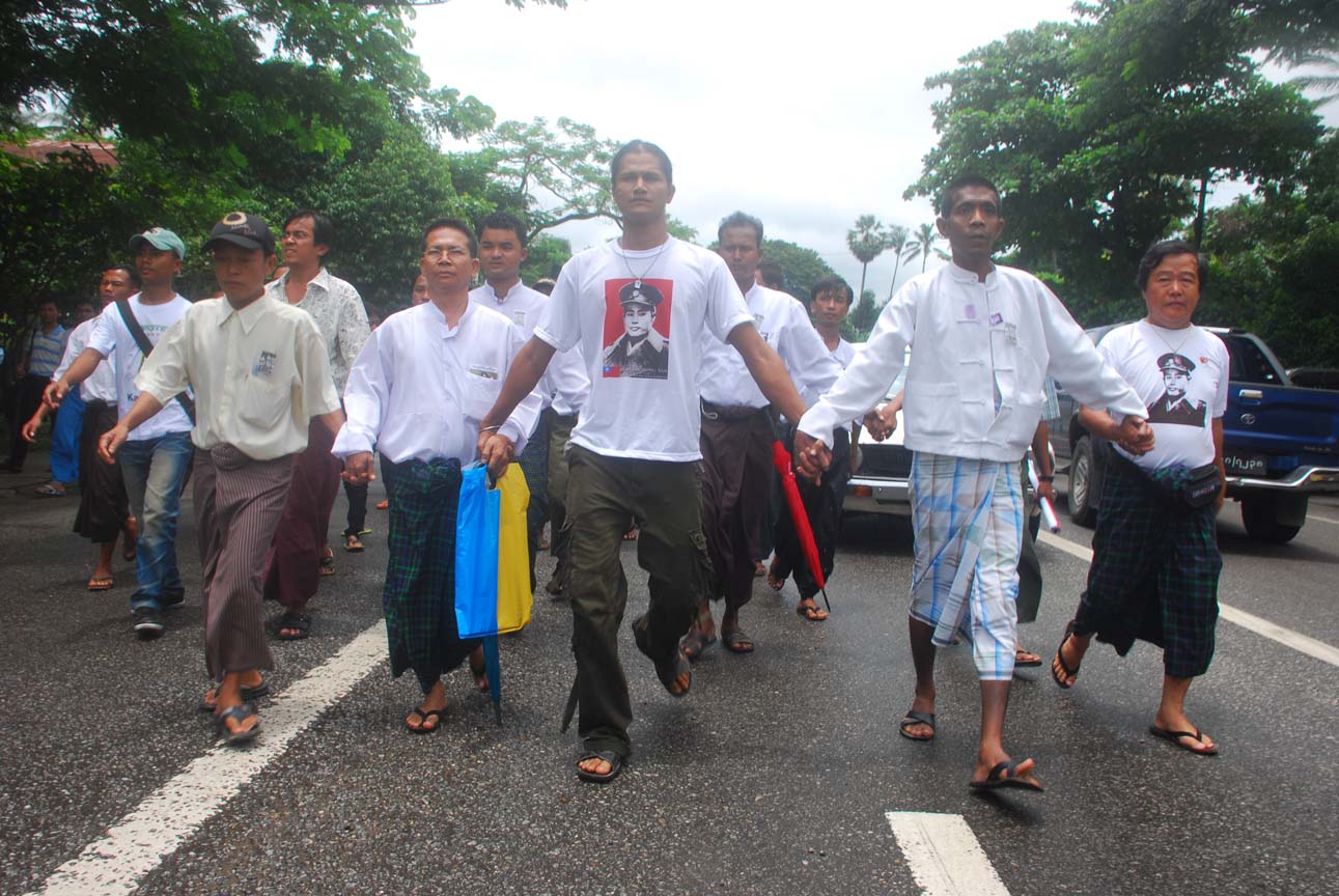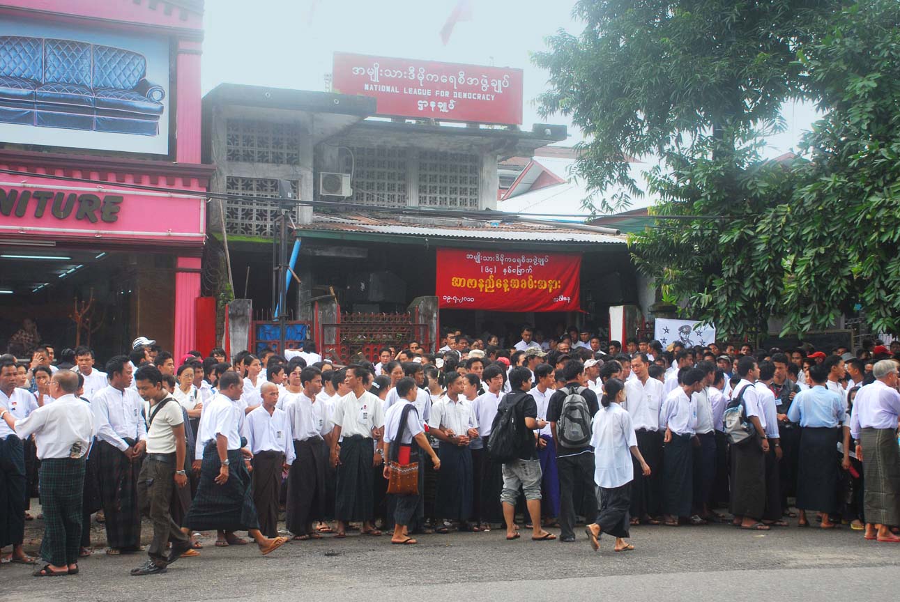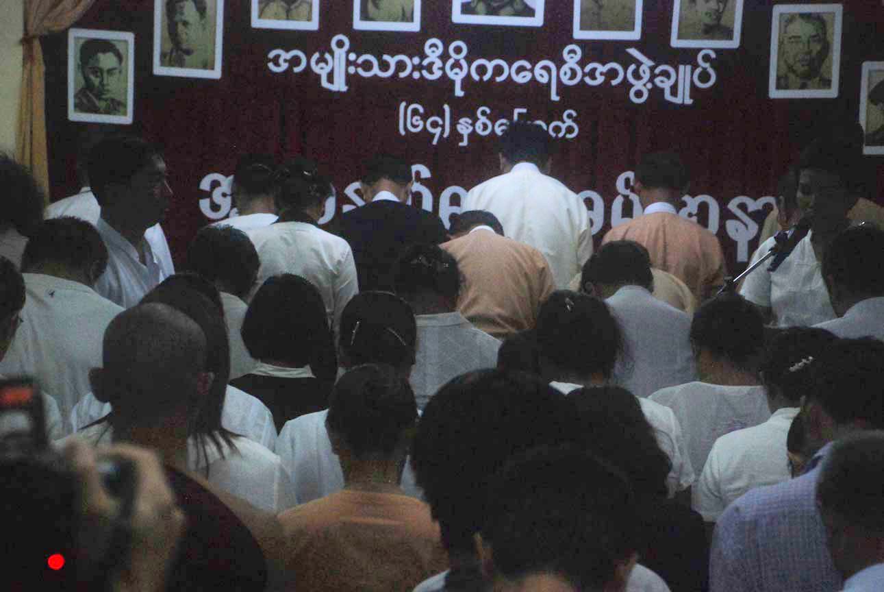 အင္န္အယ္ဒီ ရုံးခ်ဴပ္ေရွ႔မွာ နံနက္ ၈ နာရီေလာက္က စျပီး အင္န္အယ္ဒီပါတီ၀င္ေတြ အာဇာနည္ေန႔ အခမ္းအနားကို လာေရာက္နားေထာင္တဲ့ လူထုပရိသတ္ေတြနဲ႔ တျဖည္းျဖည္း စည္ကားလာခဲ့ပါတယ္။ အဖြဲ႔ခ်ဳပ္ရုံးရွိရာကို ခ်ီတက္လာတဲ့ ၈၈ မ်ဴိးဆက္ေက်ာင္းသားအဖြဲ႔ေတြ ေရာက္ရွိလာႏိုင္မွာ နံနက္ ၉ နာရီ ခြဲပါျပီ။ ဒီမတိုင္ခင္ေလးမွာပဲ တိုင္းရင္းသားစည္းလုံးညီညြတ္ေရးပါတီက လူအင္အား ၁၀၀ ေက်ာ္ေလာက္ဟာ အဖြဲ႔ခ်ဴပ္ေရွ႔က ျဖတ္သန္းျပီး အာဇာနည္ကုန္းဘက္ကို အေလးျပဳဖို႔ ေျခလ်င္ ခ်ီတက္သြားတာကို ေတြ႔လိုက္ရပါတယ္။