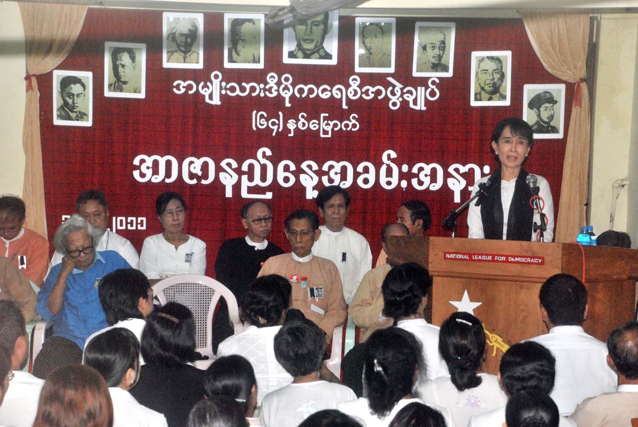 အဖြဲ႔ခ်ဴပ္မွာ အာဇာနည္ေန႔အခမ္းအနားကို ၁၀ နာရီခြဲမွာ စတင္ျပီး ေဒၚေအာင္ဆန္းစုၾကည္ အပါအ၀င္ အင္န္အယ္ဒီပါတီက ဗဟိုေကာ္မီတီ၀င္မ်ား အားလုံး ရုံးခ်ဴပ္ေရွ႔မွာ ထြက္ျပီးေတာ့ အာဇာနည္ကုနး္ဖက္ကို မ်က္ႏွာမူကာ အမ်ဴိးသားေခါင္းေဆာင္ၾကီး ဗိုလ္ခ်ဳပ္ေအာင္ဆန္းနဲ႔တကြ က်ဆုံးေလျပီးေသာ အာဇာနည္ၾကီးမ်ားကို အေလးျပဳၾကပါတယ္။ အခမ္းအနားမွ သဘာပတိအျဖစ္ ဦးတင္ဦးက ေဆာင္ရြက္ျပီး ဗိုလ္ခ်ဳပ္ေအာင္ဆန္းရဲ့ ေစ့စပ္ညိွႏႈိင္း အေျဖရွာတဲ့နည္းနဲ႔ လြတ္လပ္ေရးအရယူခဲ့ပုံကို တင္ျပေျပာၾကားခဲ့ပါတယ္။