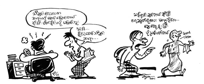 စာေပလြတ္လပ္ခြင့္ အခ်ဳိ႕အဝက္ရလာေတာ့ မဆိုးဘူး။ ေကာင္းတယ္လို႔ျမင္တဲ့ အေကာင္း ျမင္သမားေတြ ေတြ႕ရတယ္။ ကြၽန္ေတာ္က ကာတြန္းဆရာဆိုေတာ့ အဆိုးျမင္တတ္သူလို႔ ထင္ၾကတယ္။ ကြၽန္ေတာ္ အဆိုးျမင္ မ ဟုတ္ပါဘူး။ အမွန္ျမင္ပါ။ အေကာင္းျမင္၊ အဆိုးျမင္ကို ေရခြက္ထဲမွာ ေရတစ္ဝက္ရွိတာနဲ႔ ဥပမာေပးၾကတယ္။ အေကာင္းျမင္သမားက ခြက္ထဲမွာ ေရတစ္ဝက္ ရွိေနတယ္လို႔ ျမင္တယ္။ အဆိုးျမင္သမားက ခြက္ထဲမွာ ေရတစ္ဝက္ ေလ်ာ့ေနတယ္လို႔ ျမင္တယ္။